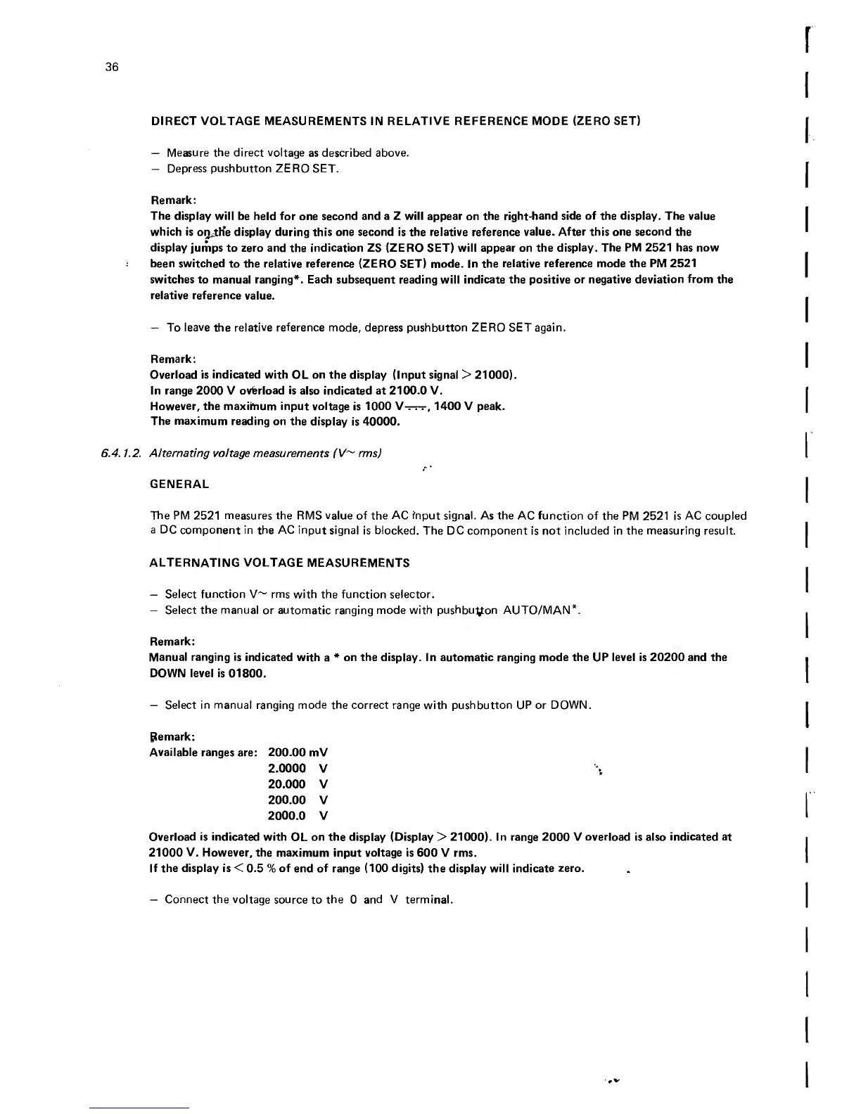Philips pm2521 - DIRECT VOLTAGE MEASUREMENTS IN RELATIVE REFERENCE MODE (ZERO SET); 6.4.1.2. Alternating voltage measurements (V~ rms); ALTERNATING VOLTAGE MEASUREMENTS