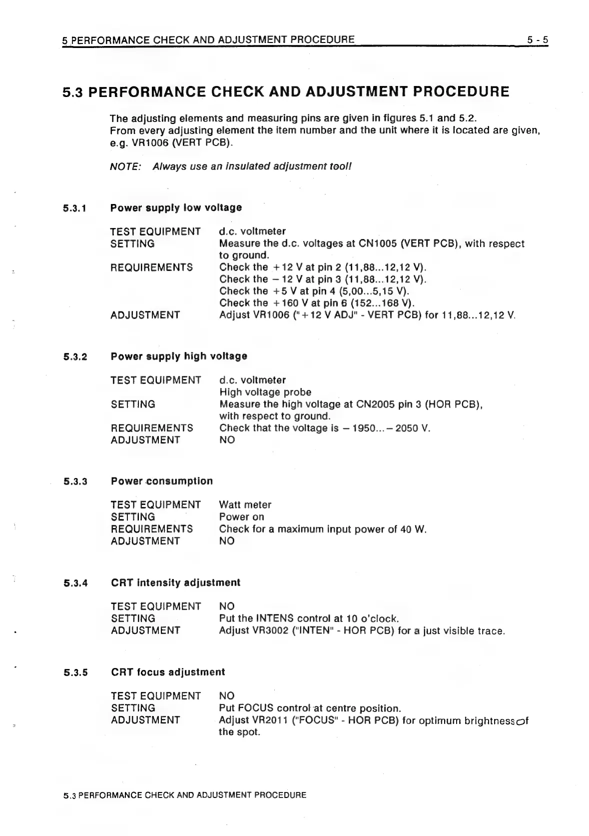 Philips PM3208 - 5.3.1 Power Supply Low Voltage; 5.3.2 Power Supply High Voltage; 5.3.3 Power Consumption; 5.3.4 CRT Intensity Adjustment