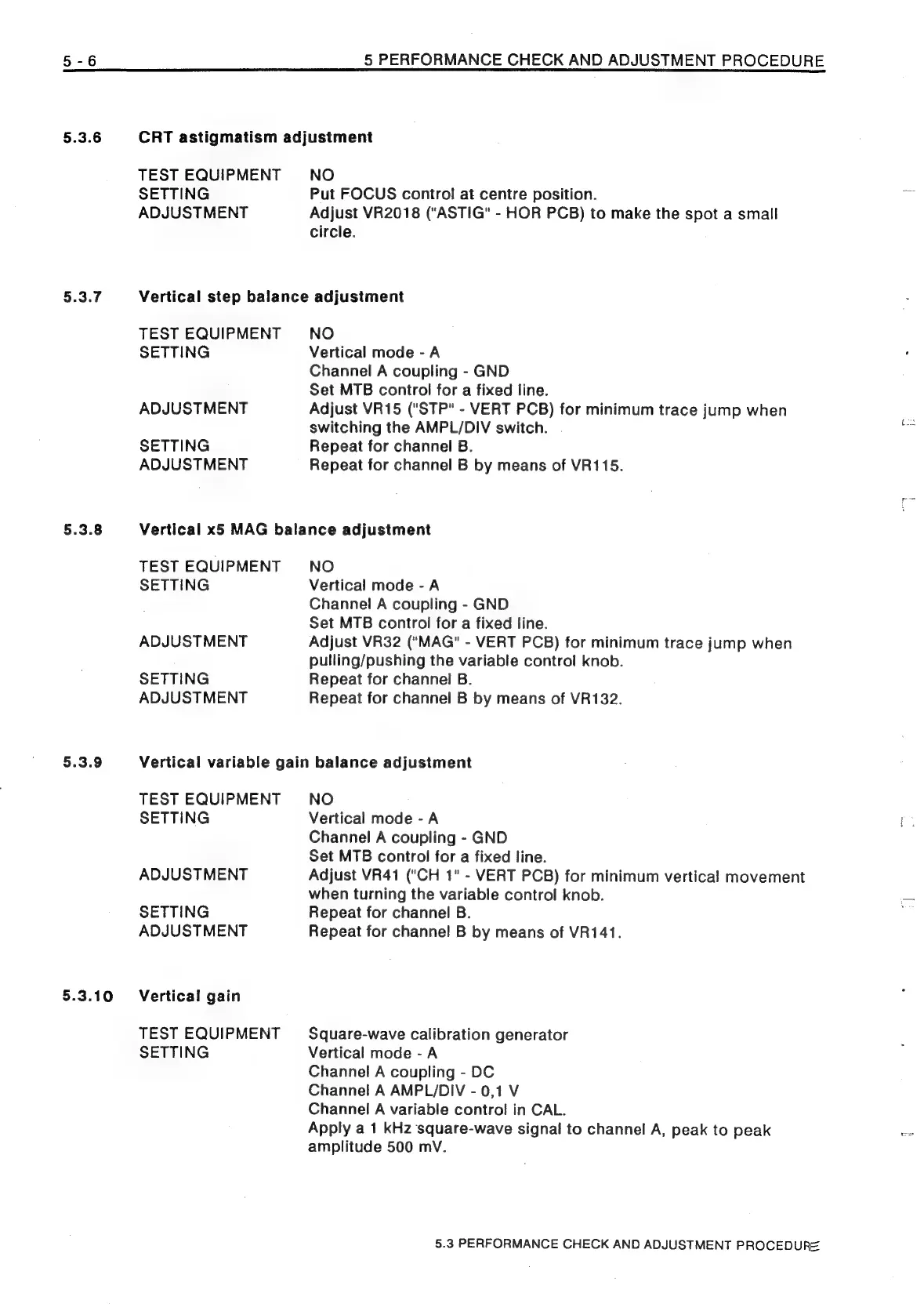Philips PM3208 - 5.3.6 CRT Astigmatism Adjustment; 5.3.7 Vertical Step Balance Adjustment; 5.3.8 Vertical x5 MAG Balance Adjustment; 5.3.9 Vertical Variable Gain Balance Adjustment