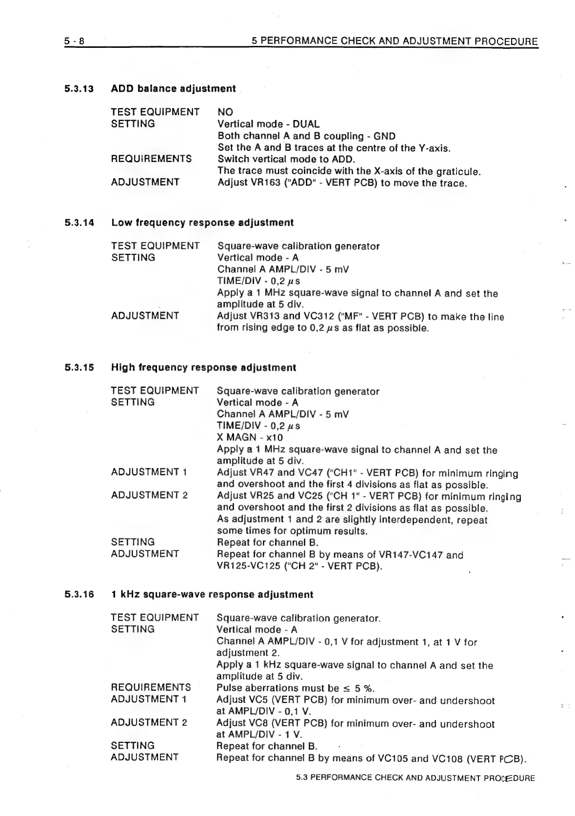 Philips PM3208 - 5.3.13 ADD Balance Adjustment; 5.3.14 Low Frequency Response Adjustment; 5.3.15 High Frequency Response Adjustment; 5.3.16 1 kHz Square-Wave Response Adjustment