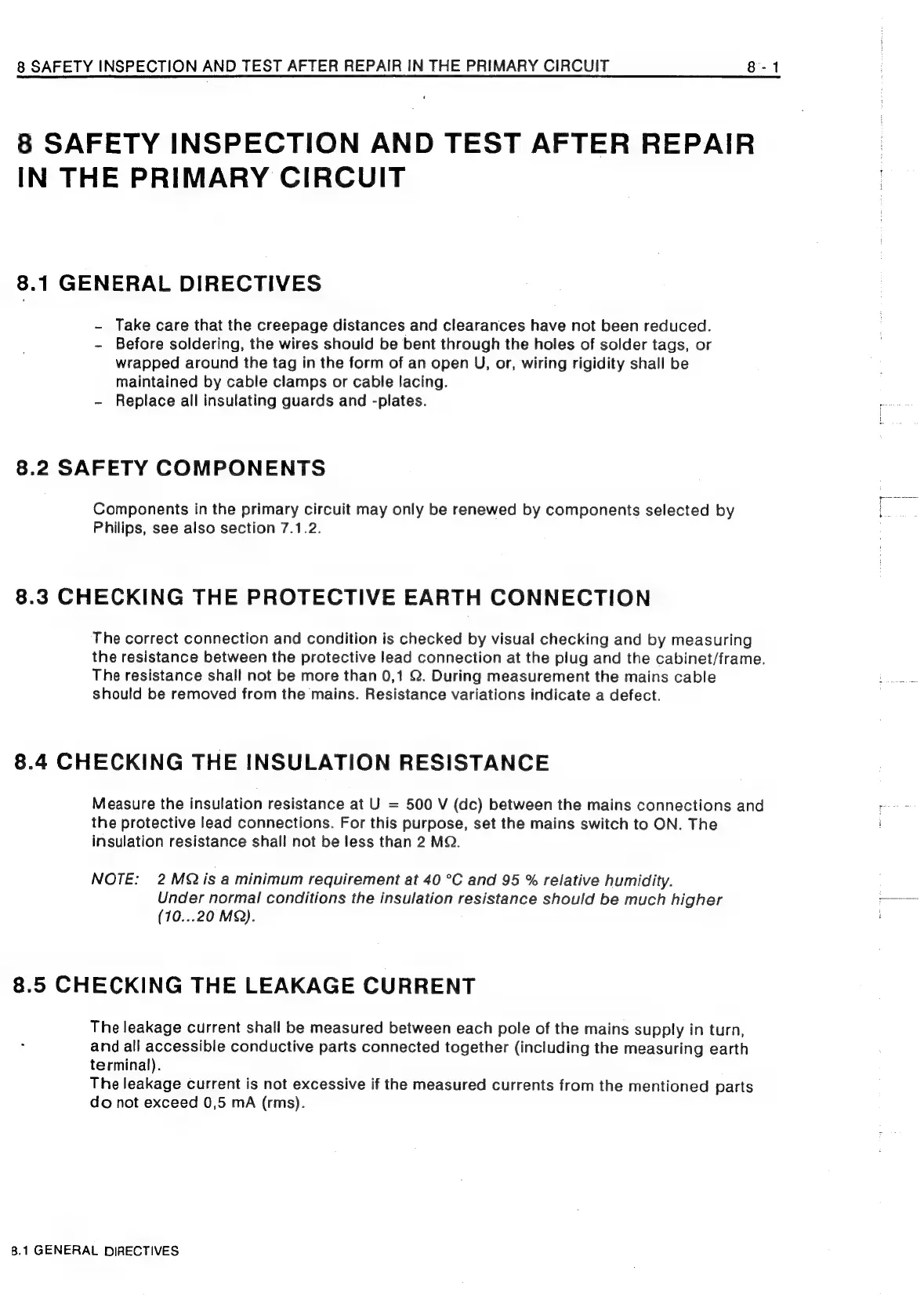 Philips PM3208 - 8 Safety Inspection and Test After Repair in the Primary Circuit; 8.1 General Directives; 8.2 Safety Components; 8.3 Checking the Protective Earth Connection