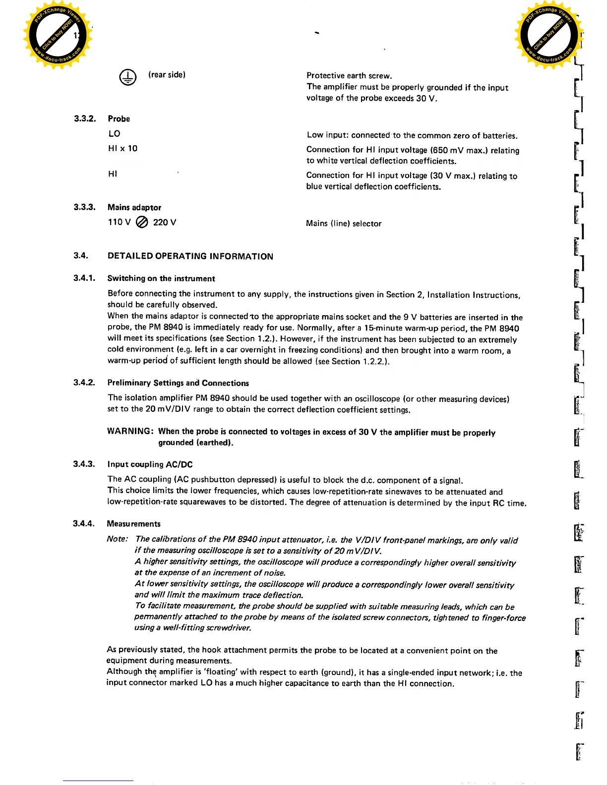 Philips PM8940 - Detailed Operating Information; Probe; Switching on the Instrument; Measurements
