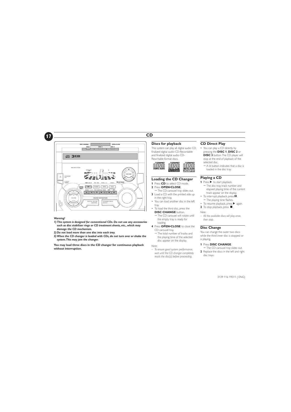 1) This system is designed for conventional CDs. Do not use any accessories