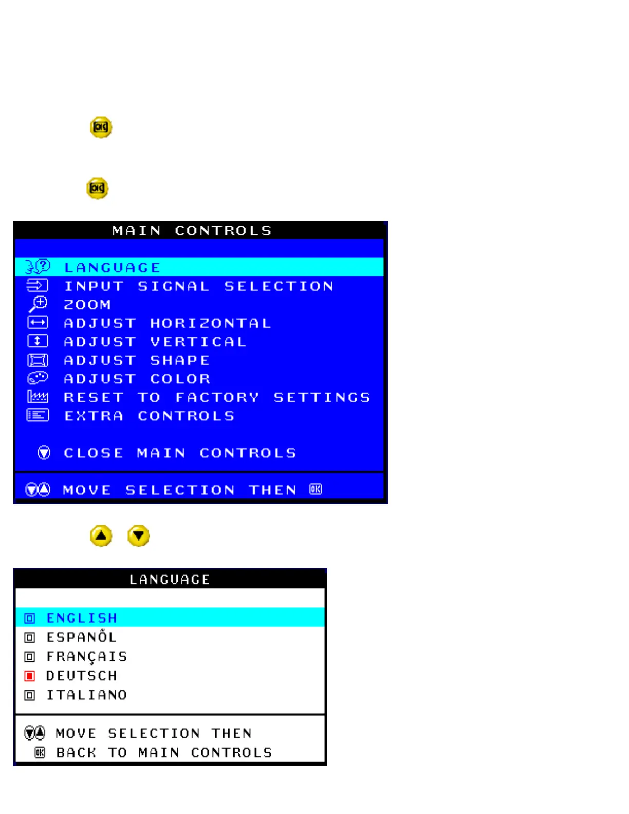 button on the monitor. The MAIN CONTROLS window appears. LANGUAGE