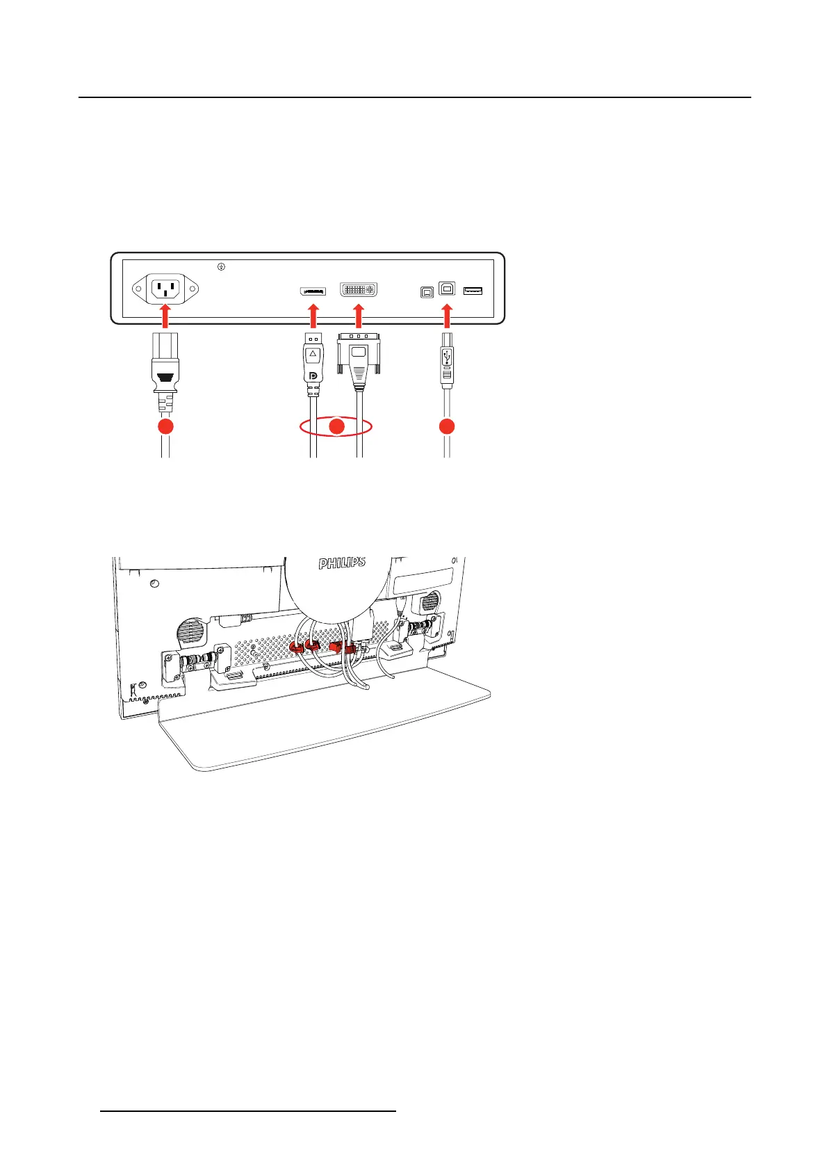 1. Route all cables trough the provided cable routing channel at the back of the monitor. Use the cable
