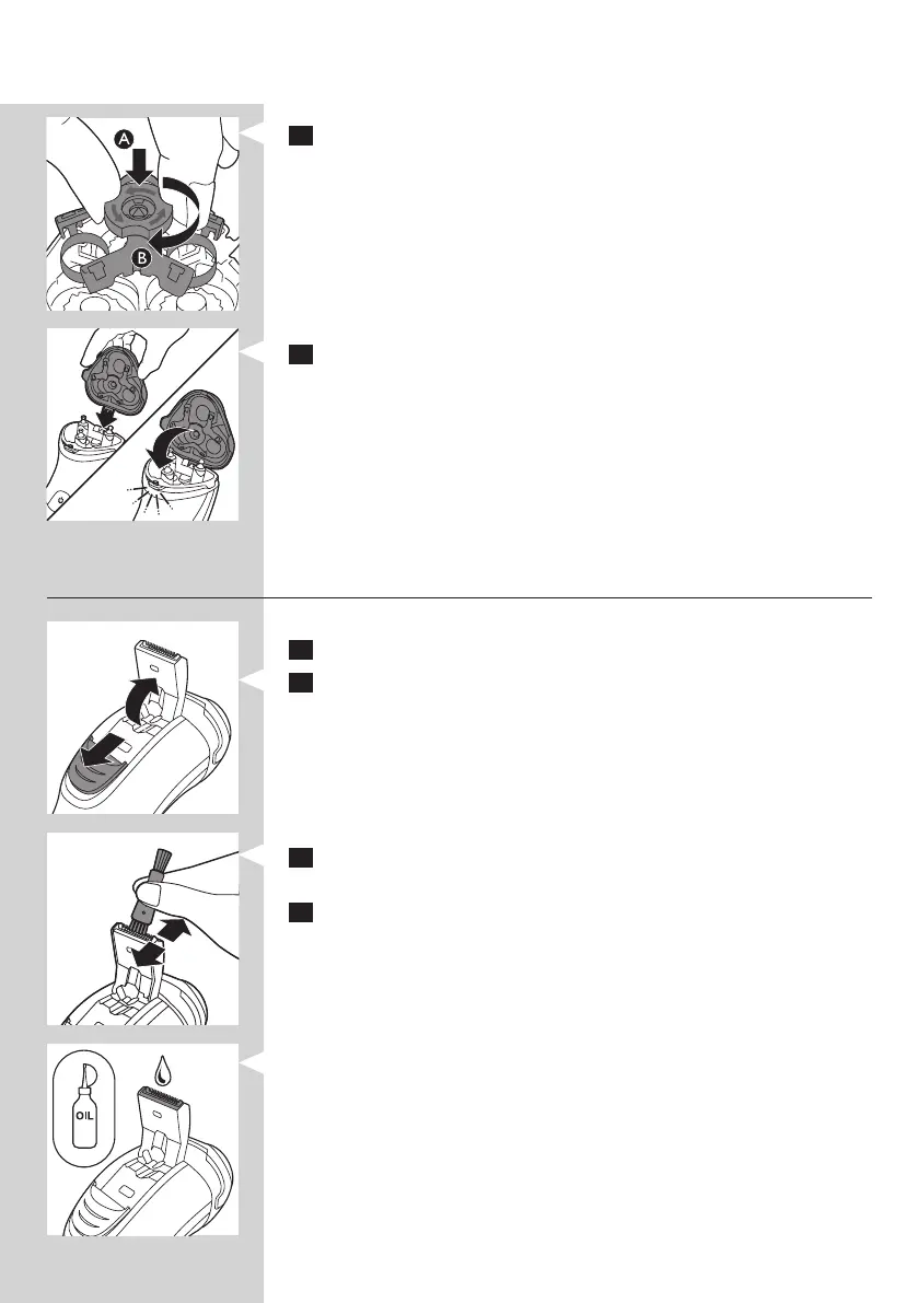 7 Sätt tillbaka hållaren i skärhuvudet (A) och vrid låset medurs (B).