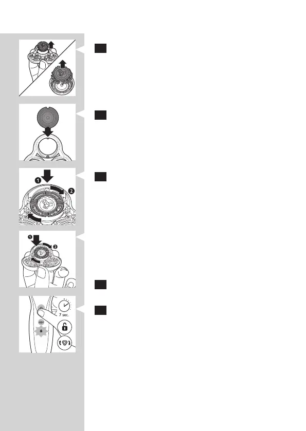6 将固定环放回剃须刀头 (1) 并将其顺时针旋