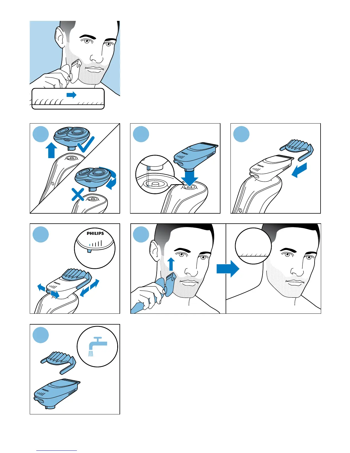 Philips S738 - Using the Trimmer Attachment; Attaching the Trimmer Comb; Adjusting Trimmer Length; Trimming Long Hairs