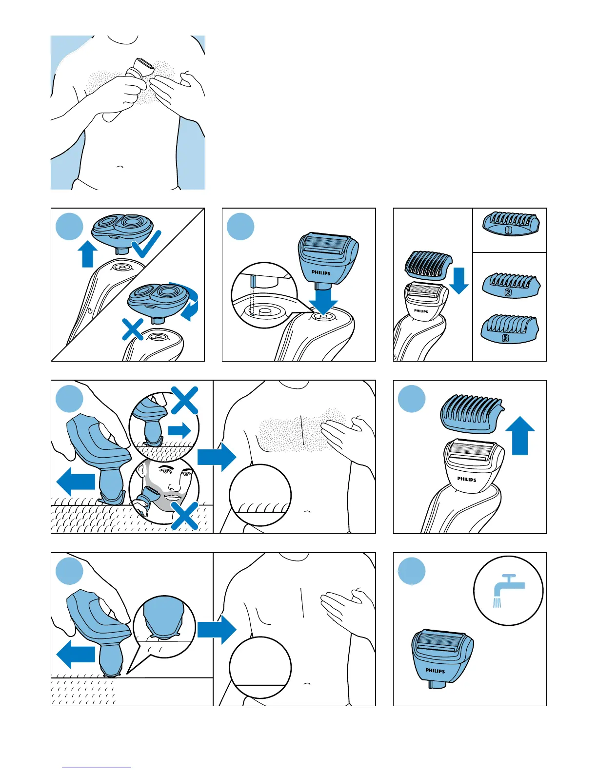 Philips S738 - Body Hair Trimming; Attaching Body Trimmer Comb; Selecting Trimmer Lengths (3-7 mm); Trimming Body Hair