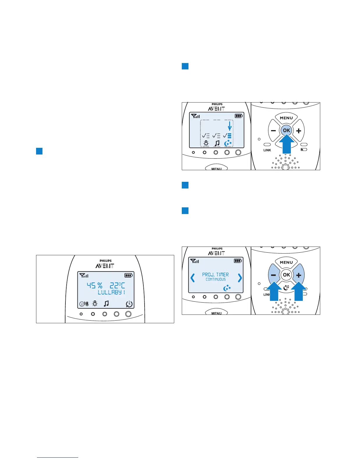 op de babyunit inschakelen en de projectieduur