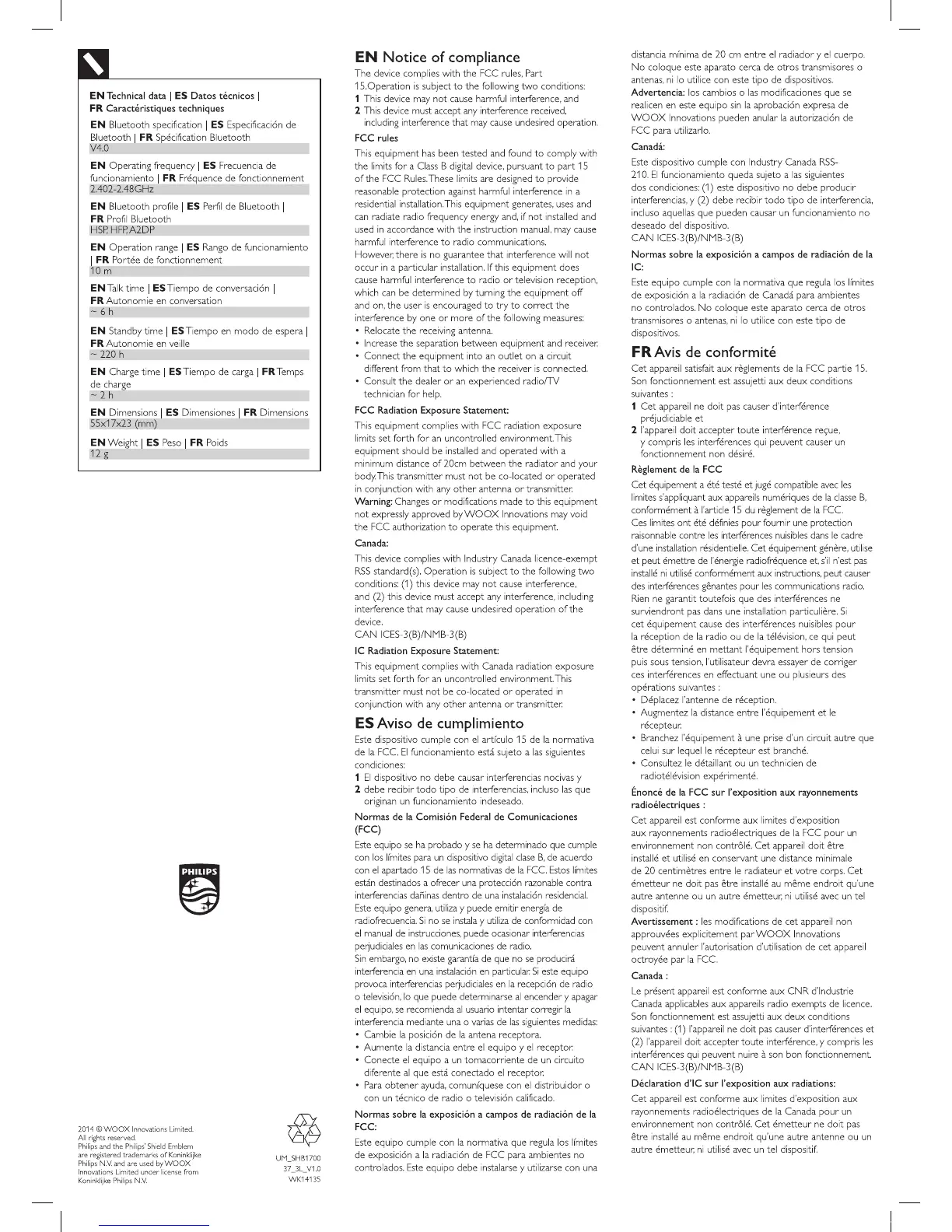 Philips shb1700 - Technical Data and Compliance; Technical Specifications; FCC Compliance Statement; FCC Radiation Exposure Statement