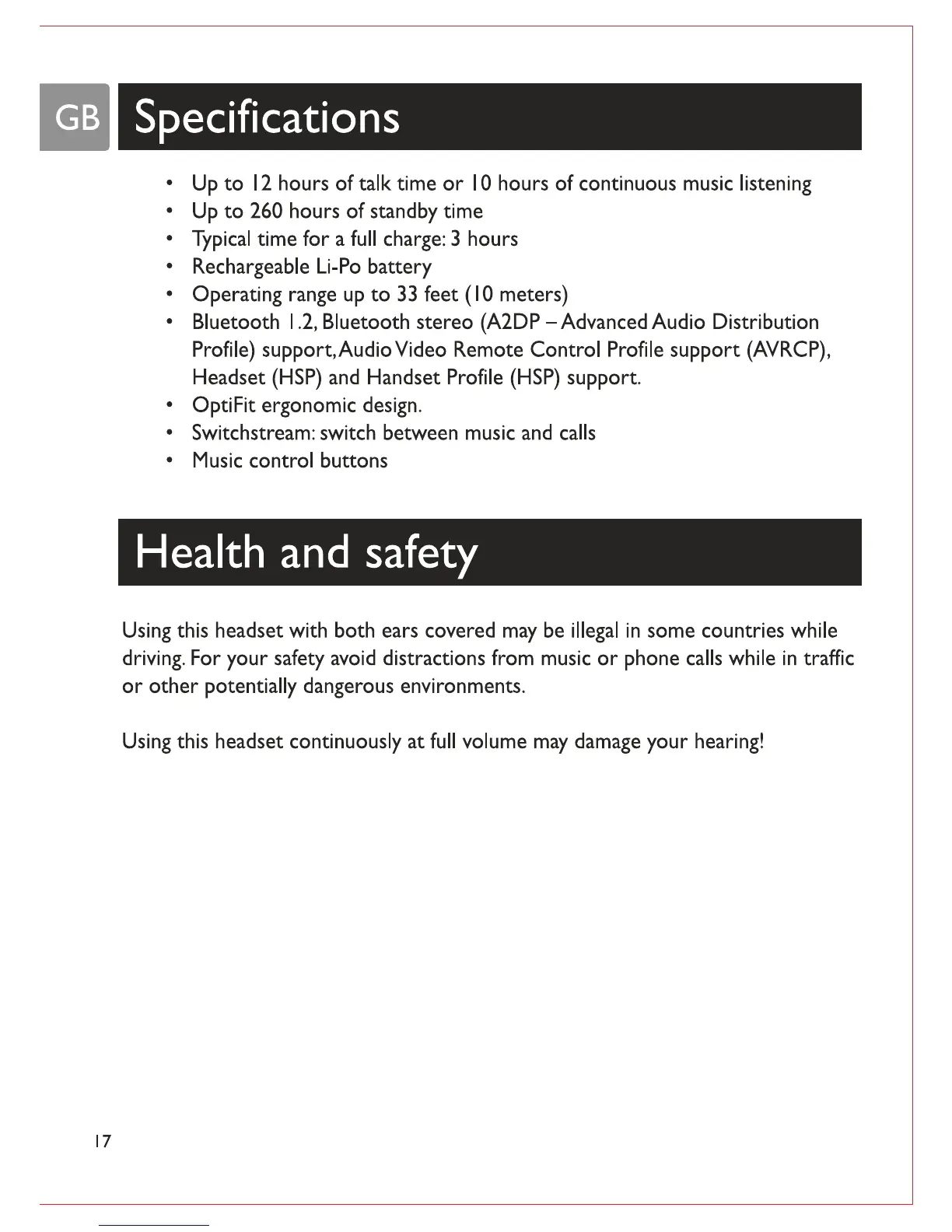 Philips SHB6100 - Technical Product Specifications; Health and Safety Warnings