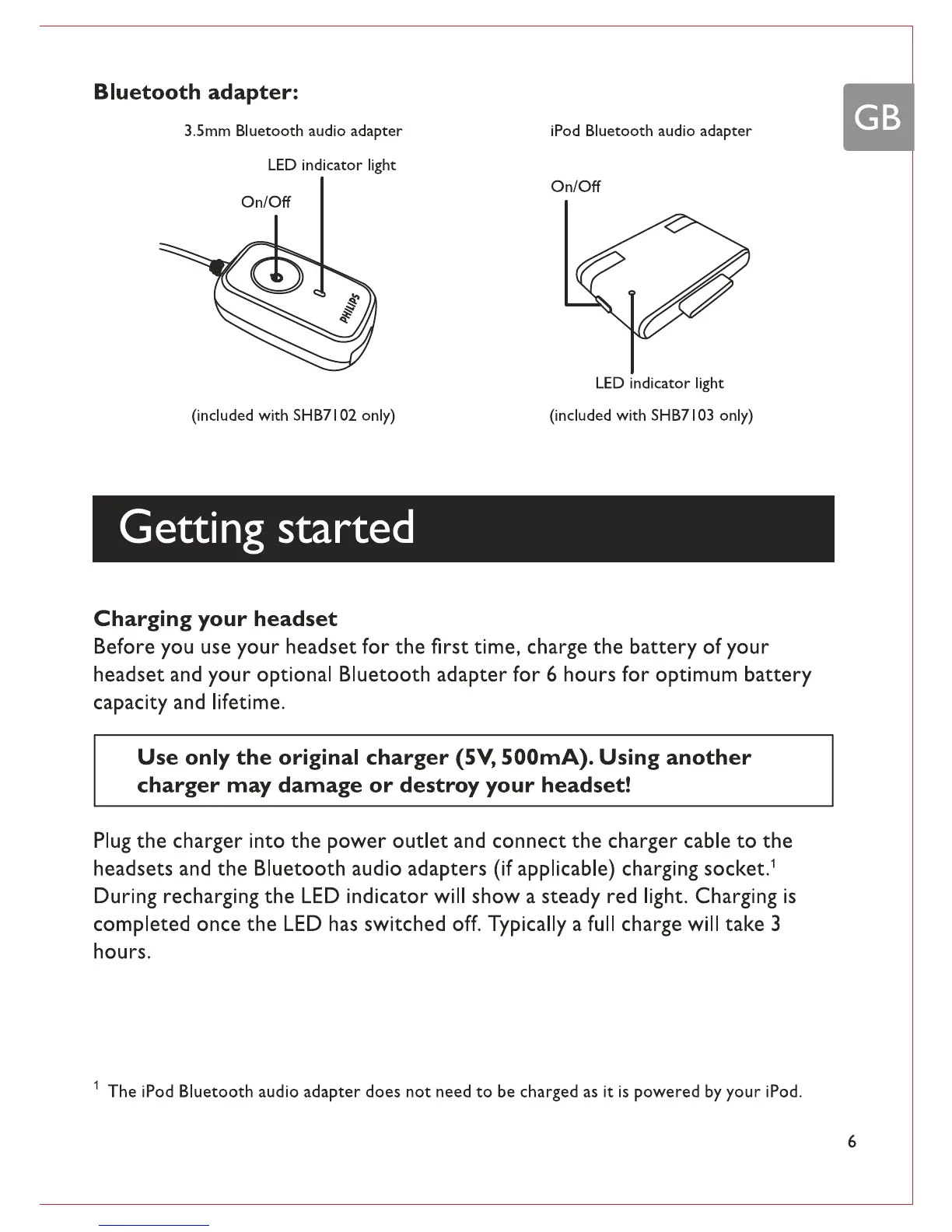 Philips SHB7102 - Getting started; Charging your headset