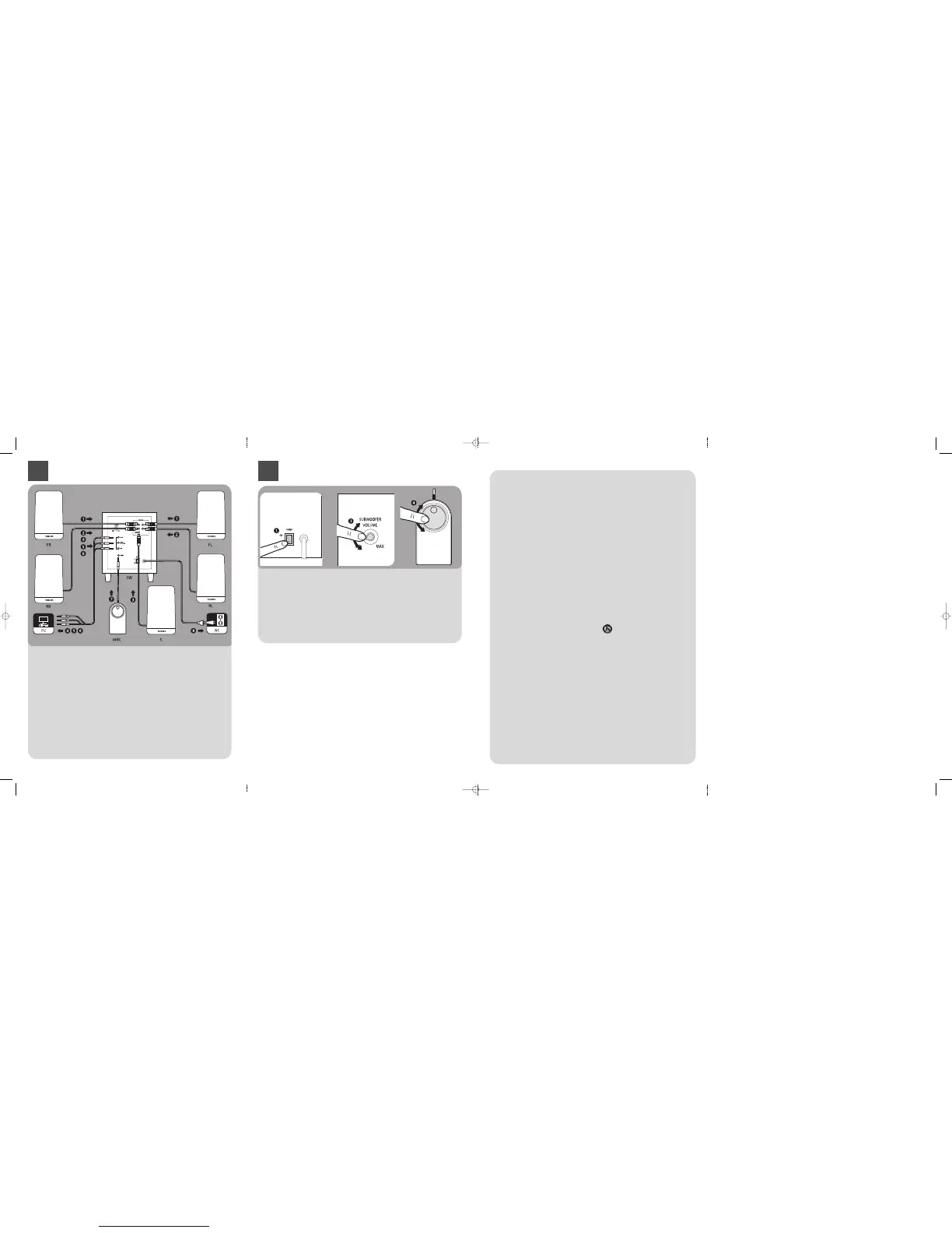 1. Connect the front satellites (red and green plugs) to the FRONT R and FRONT L