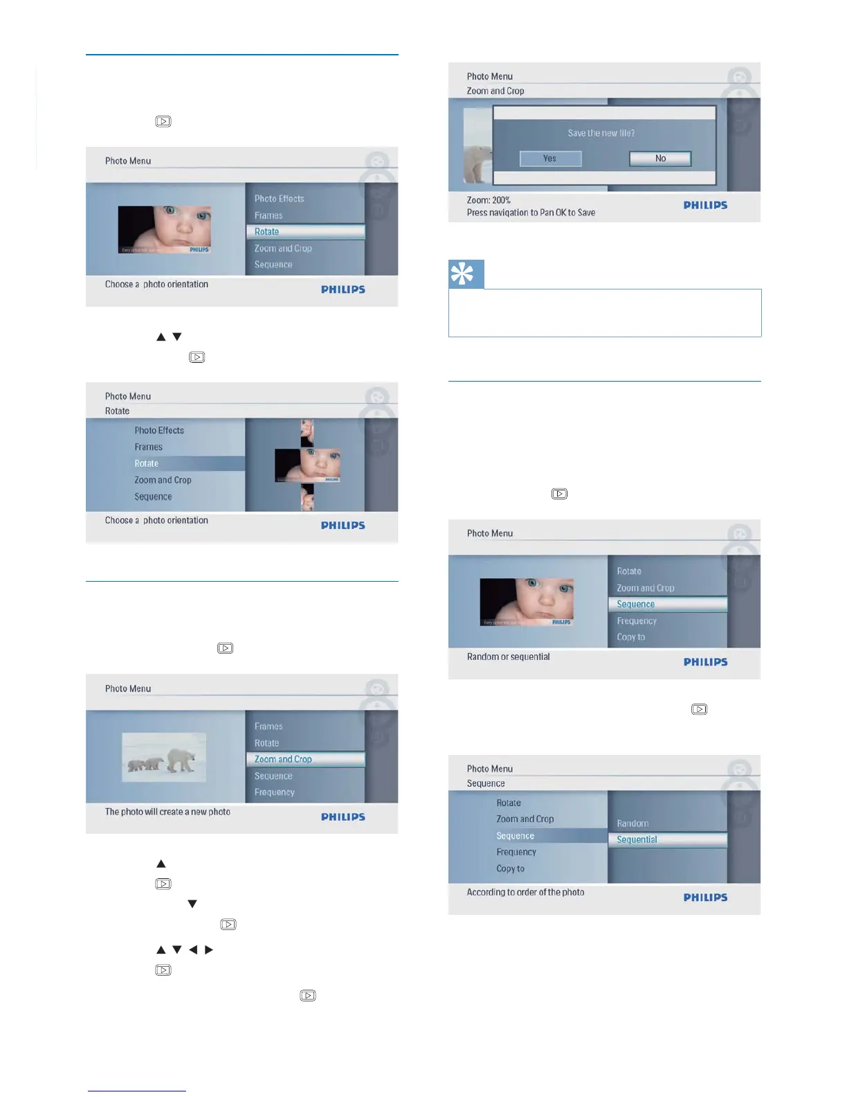 2 Press to zoom in a photo, and then