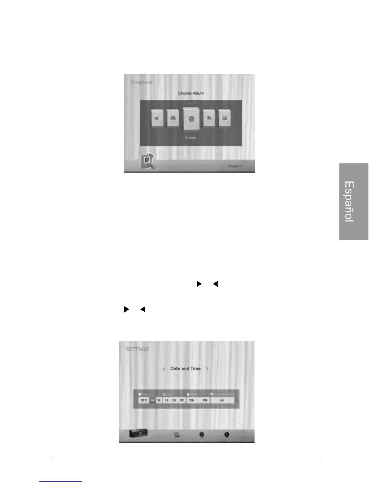 2. Presione o para alternar entre las páginas Fecha y