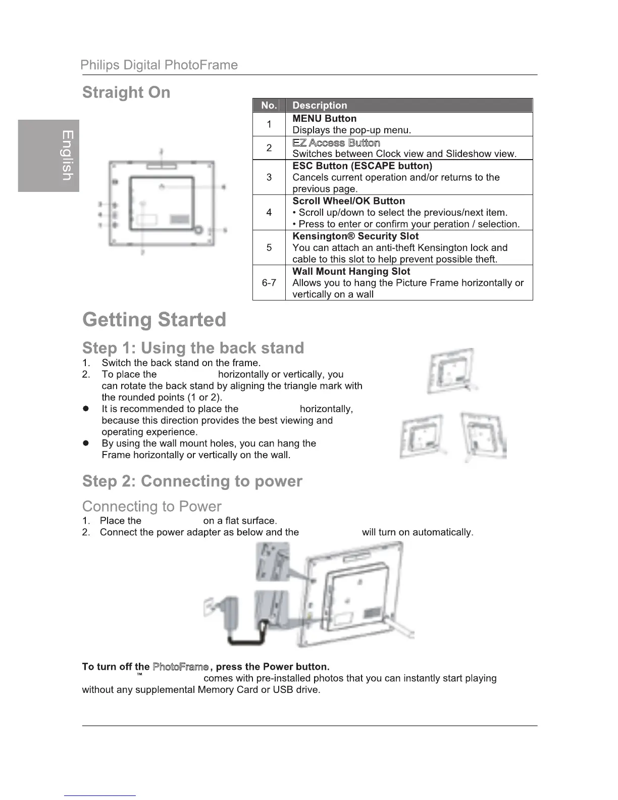Philips SPF3483/G7 - Getting Started; Attaching and Orienting the Back Stand; Connecting the PhotoFrame to Power