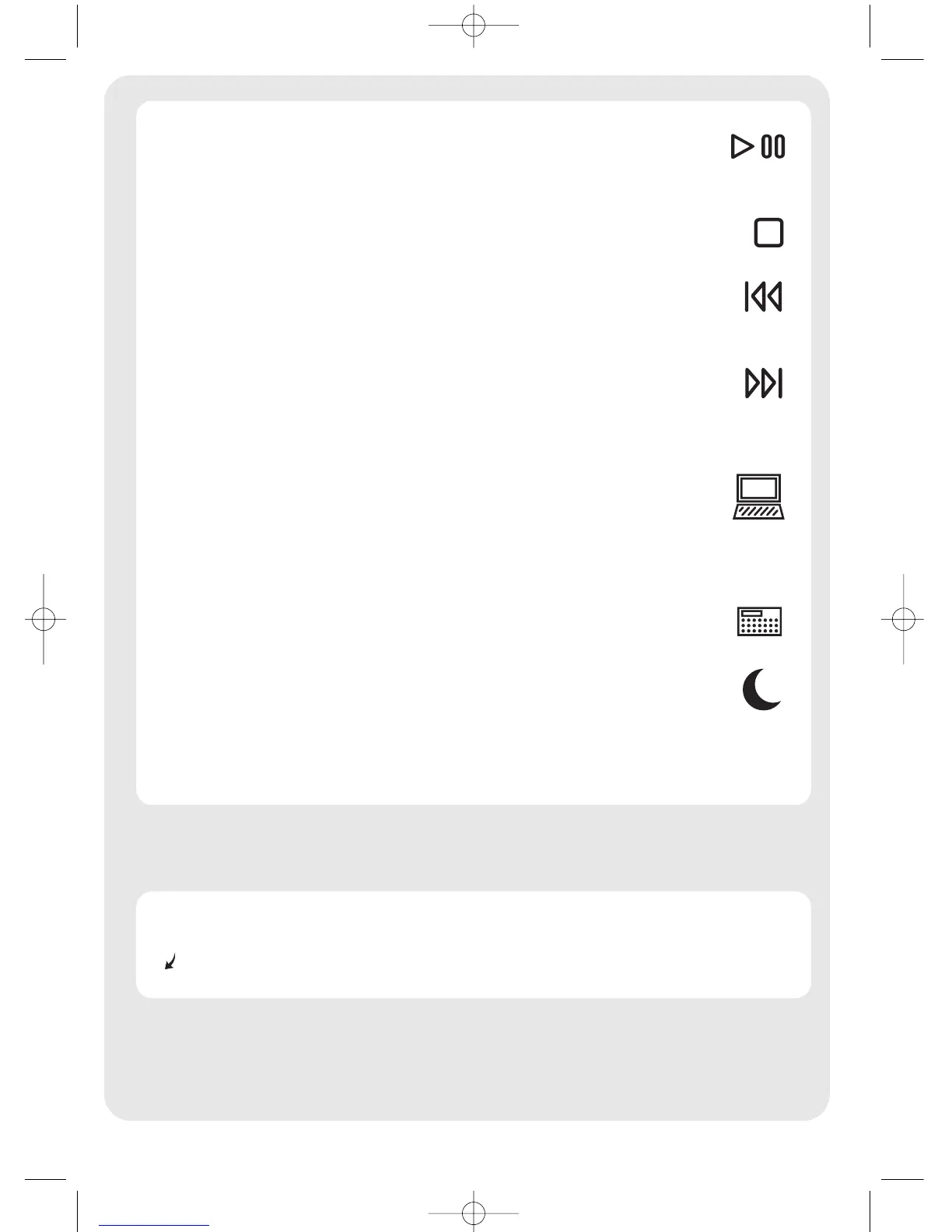 Goes back to the previous media track. Press once for each preceding