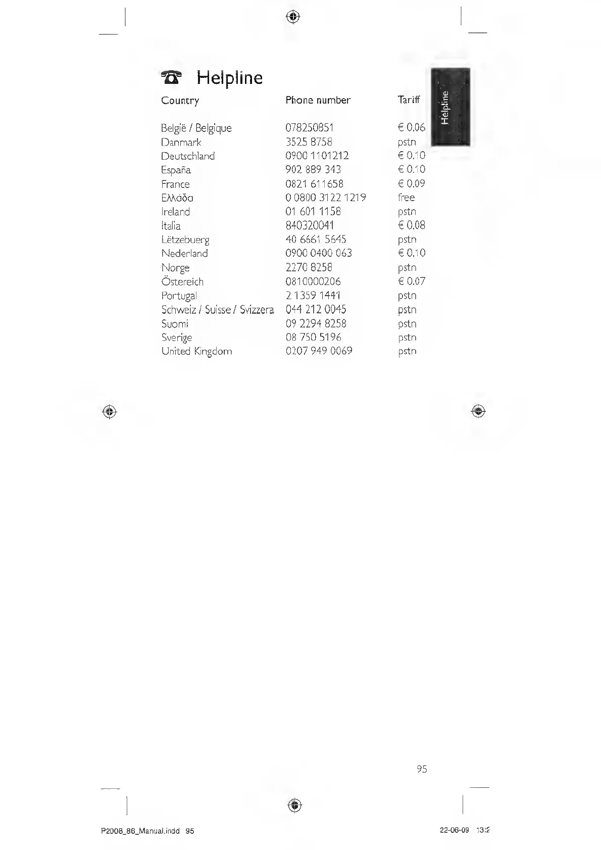 Philips SRP2008B/86 - Customer Helpline Details; Support Contact Numbers and Tariffs