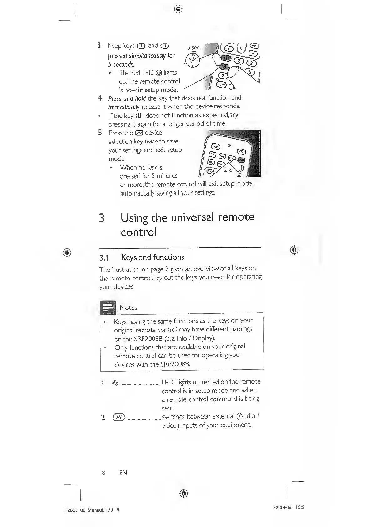 Philips SRP2008B/86 - Universal Remote Control Operation; Remote Control Keys and Functions