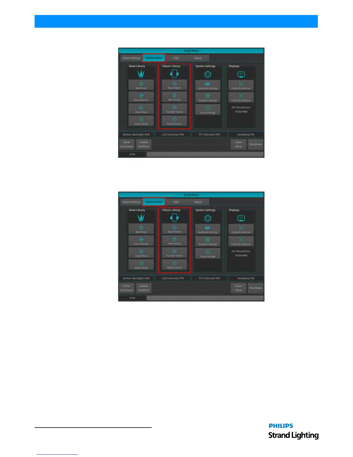 To edit the fixture library from within a show file, press the [Setup key], and select the System Setup.