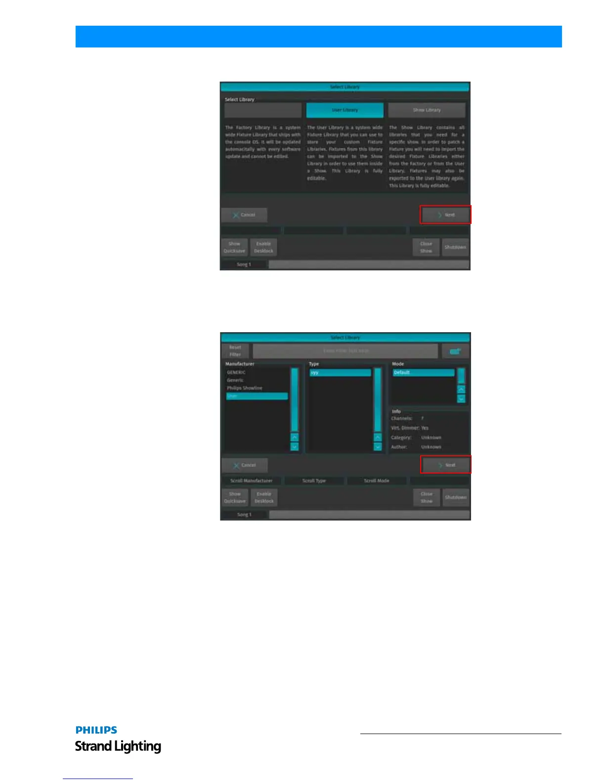 A screen asking for the source Library of the Fixture type is shown. Select the desired Library and click on Next.