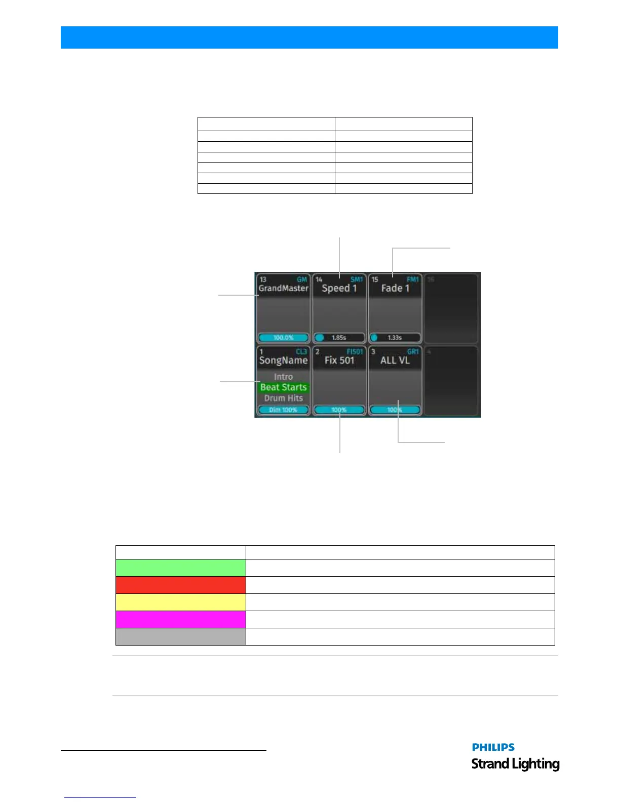 Yellow This Cue is currently in outfading state because the cuelist has been switched off.