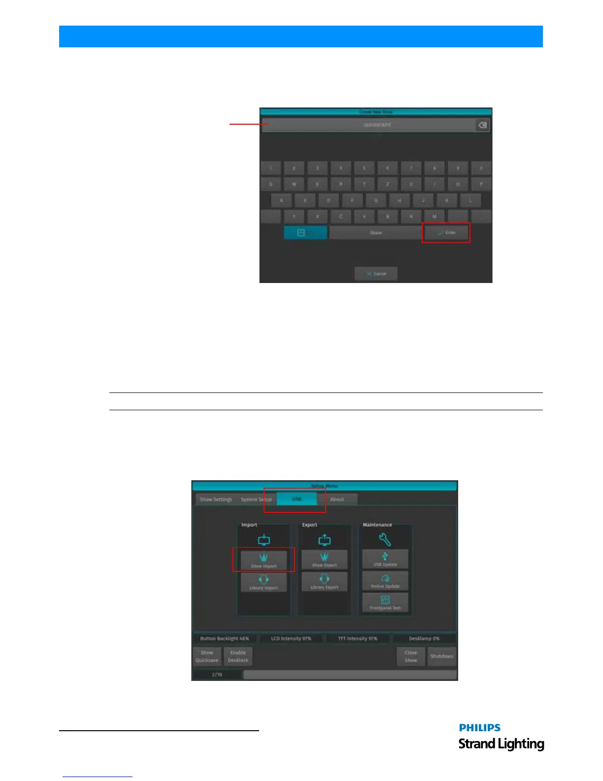 Note: Shows stored on a USB Key need to be imported into the console memory before they can be opened.