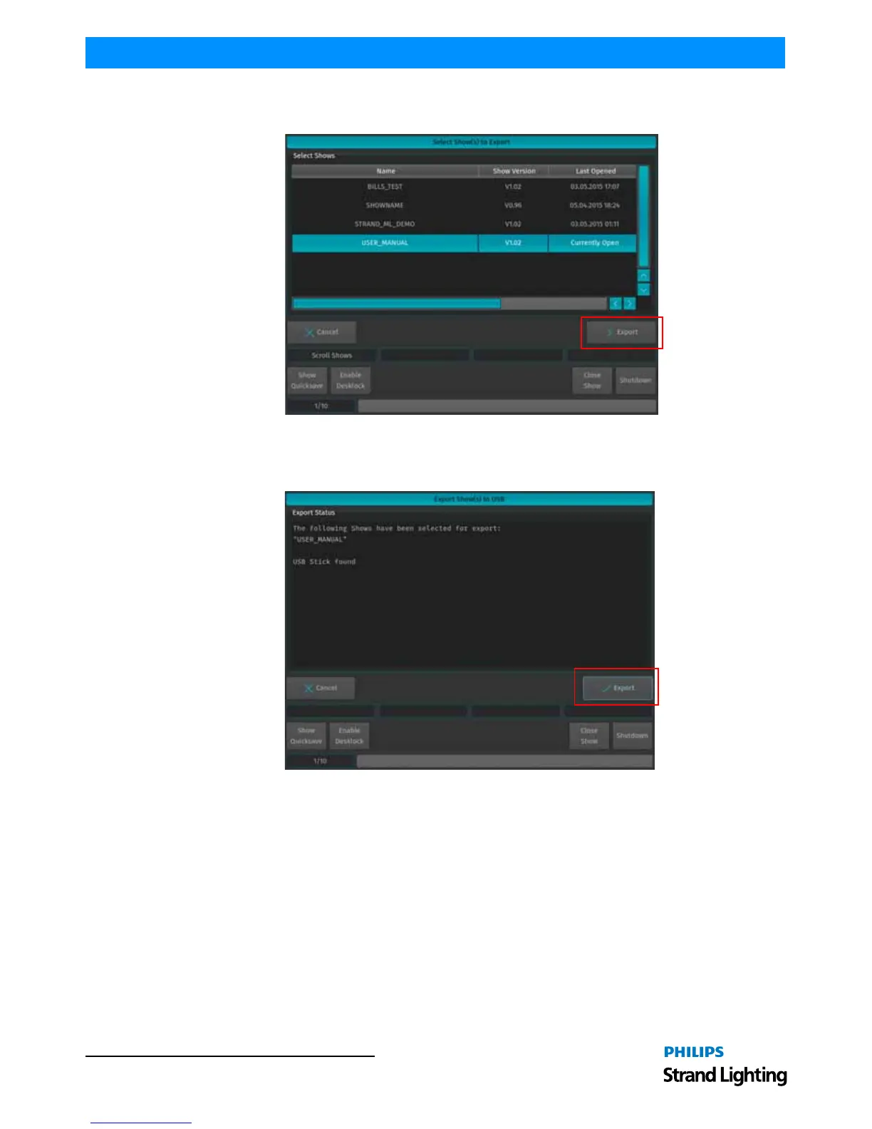 Export button to export the show(s) to the USB Key. The Export Status field will now display the export process.