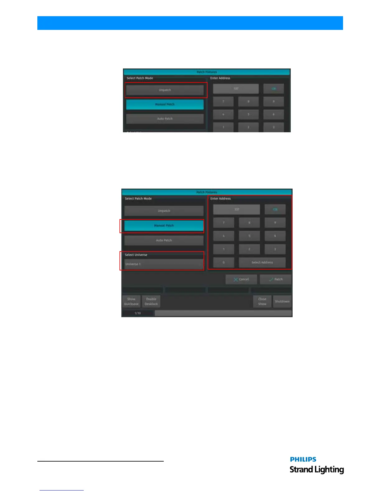 The fixtures will be patched to the address and universe specified by the user. Referring to Figure 92, select Manual
