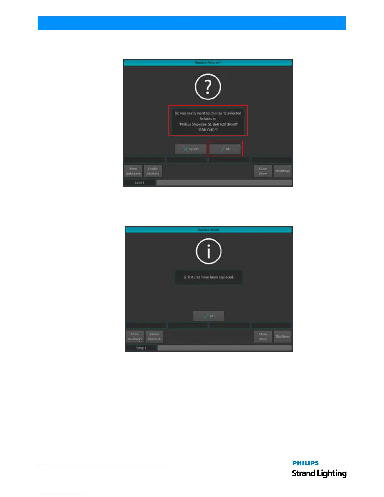 The console will now ask for confirmation on the fixture replacement (Figure 99), displaying a brief summary of the