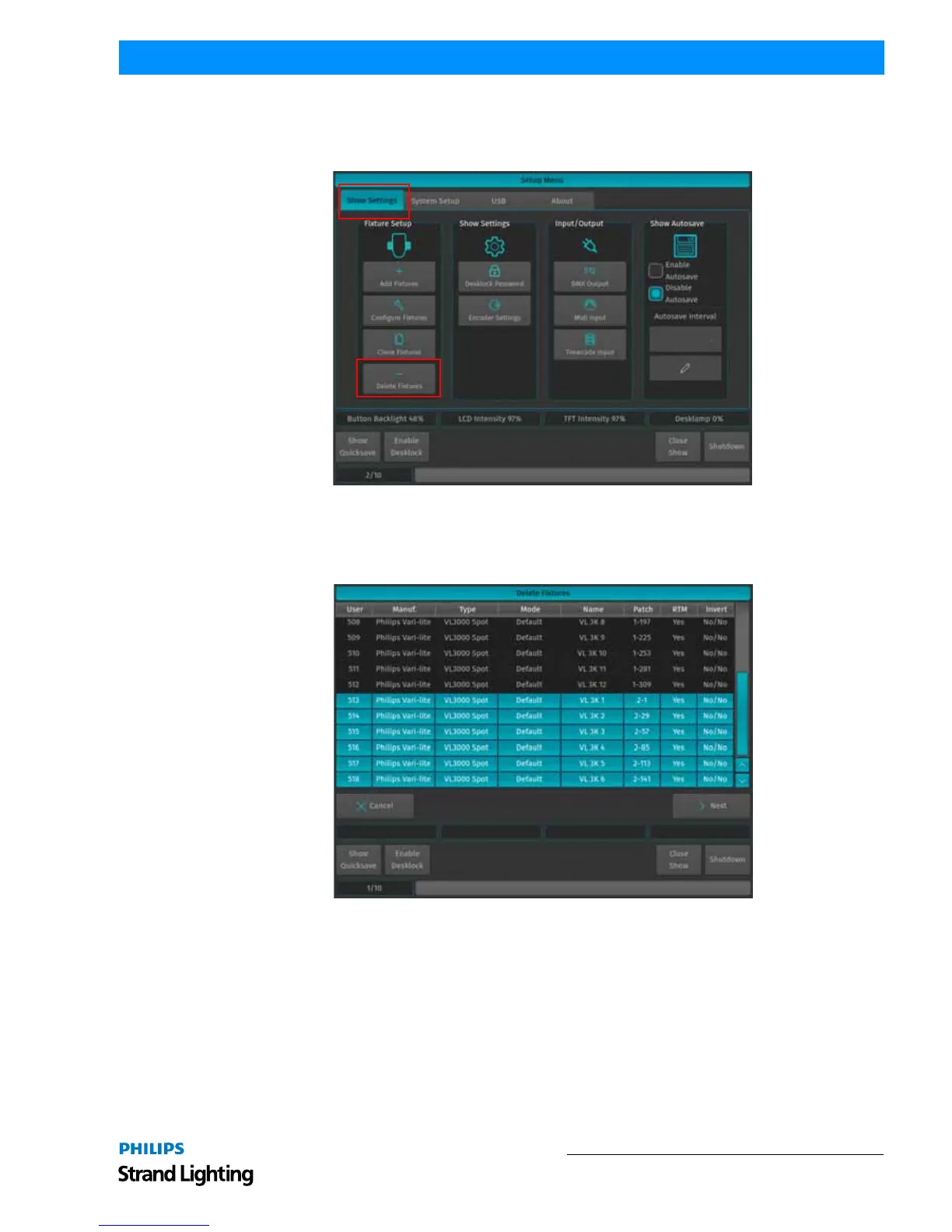 Should you wish to delete fixtures and all of their programming from the showfile, press the [SETUP] key, select the