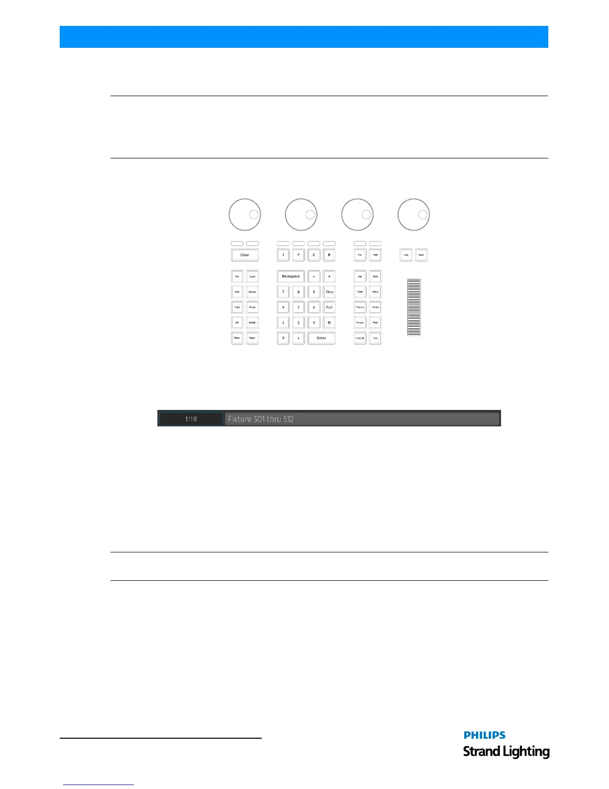 • [501] [THRU] [510] [ENTER] will select all fixtures from fixture 501 to 510.