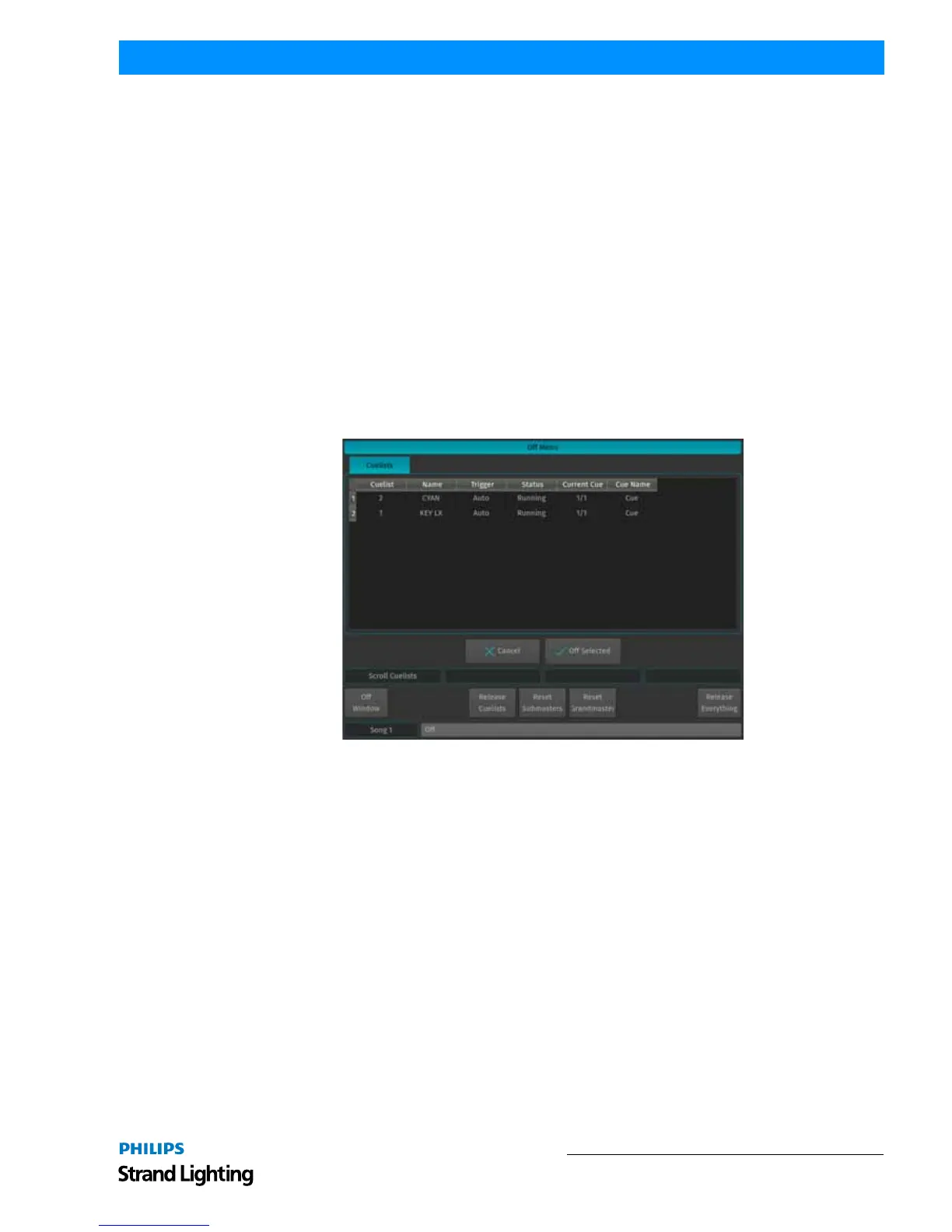The Off Window may be used to easily switch off running cuelists and to get an overview of the current Playback