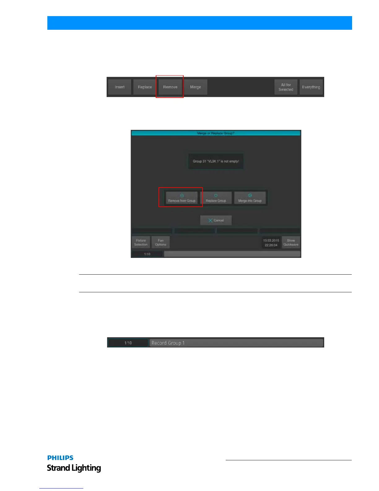 Press the [REC] key, followed by the [GROUP] key. You may now select the Remove Option in the Record Toolbar