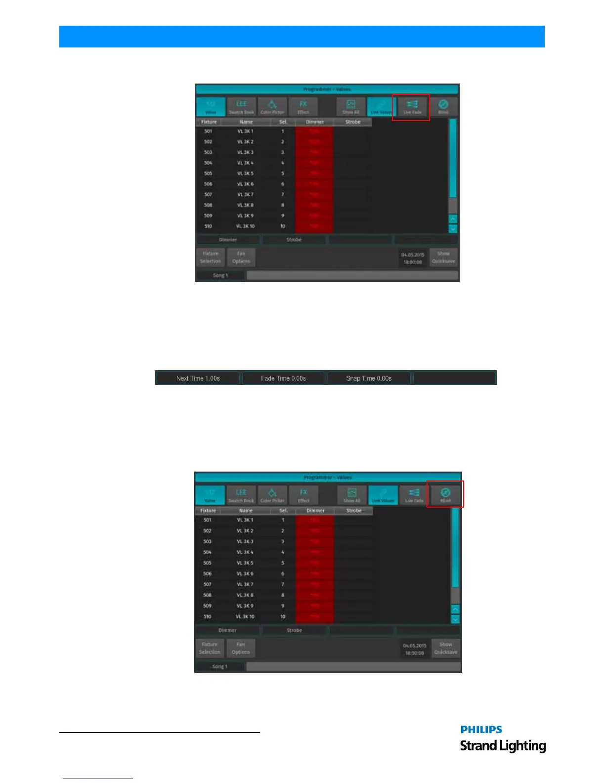When Live Fade is turned on, the console will fade changed attribute values (in example: recalled presets, entering or