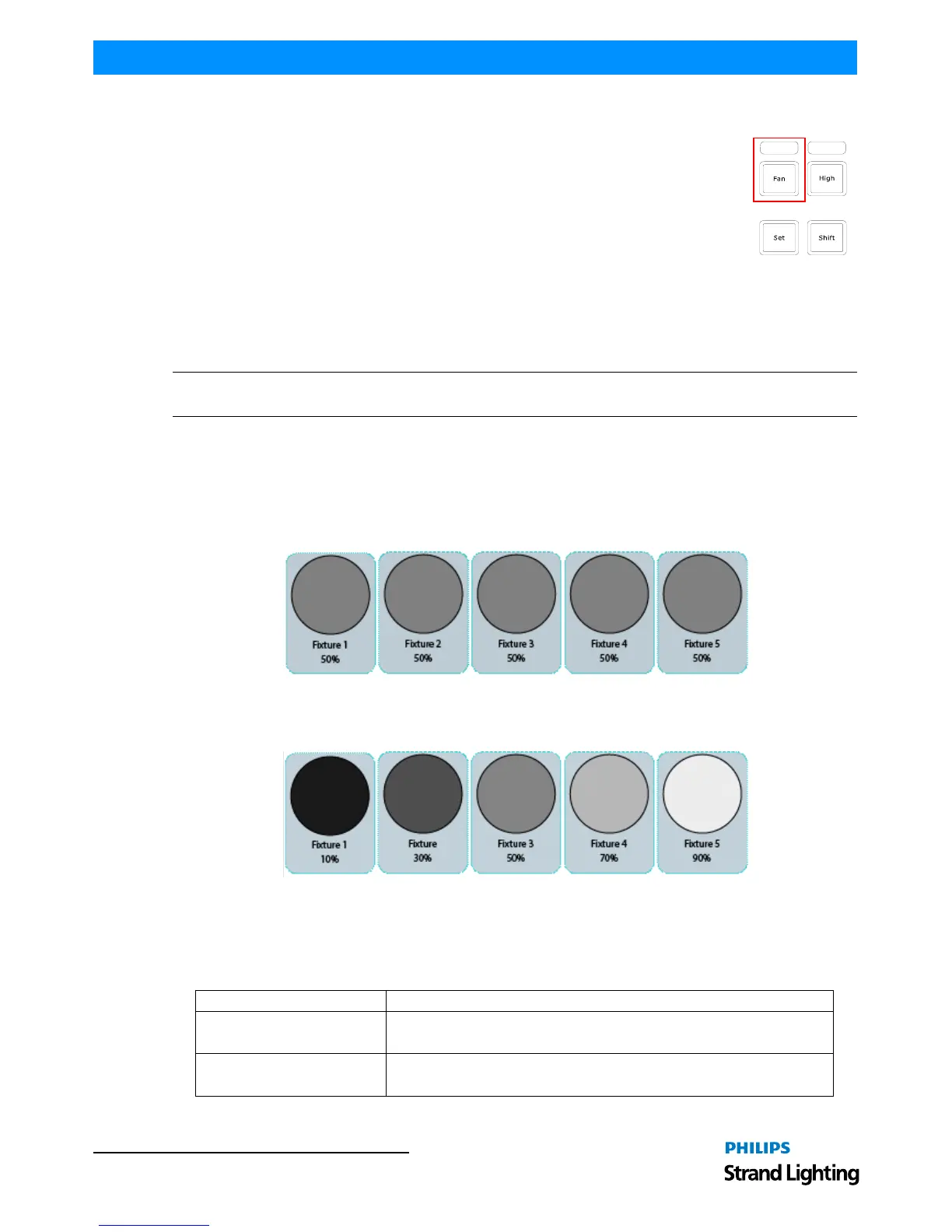To activate fanning of attributes, press the [FAN] key on the consoles faceplate. The LED above