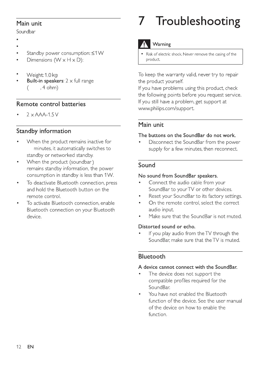 Philips TAB4108/79 - Troubleshooting Common Issues; Main Unit Operational Problems; Resolving Audio Issues; Fixing Bluetooth Connectivity
