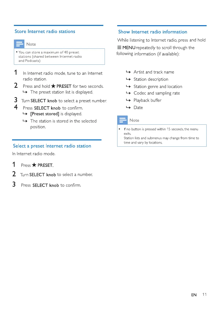 Philips TAM8905 - Store Internet Radio Stations; Select Preset Internet Radio Station; Show Internet Radio Information