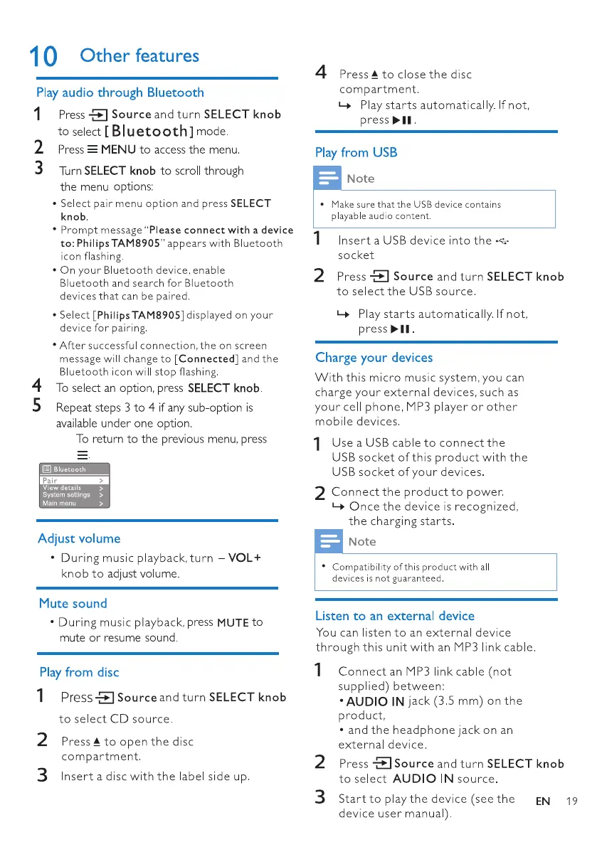 Philips TAM8905 - Other Features; Play Audio via Bluetooth; Adjust Volume; Mute Sound