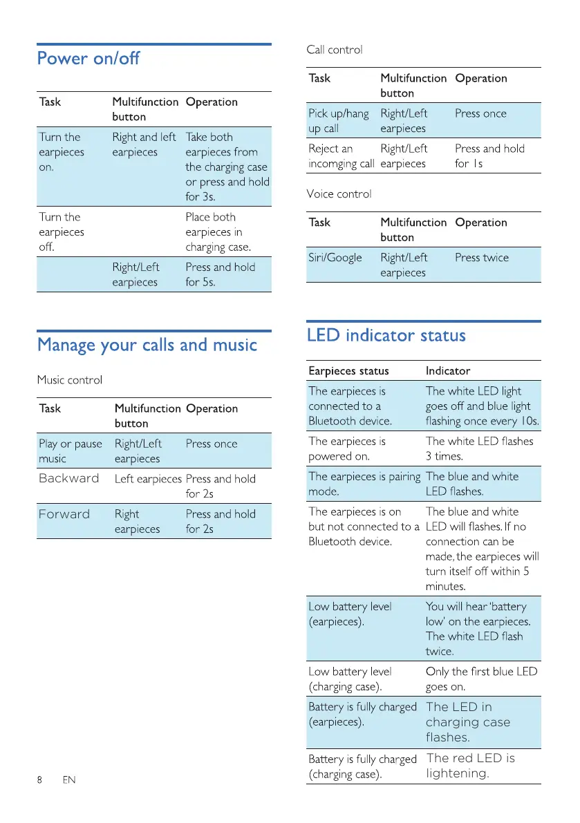 Philips TAT1215 - Powering On and Off; Managing Calls and Music; LED Indicator Status