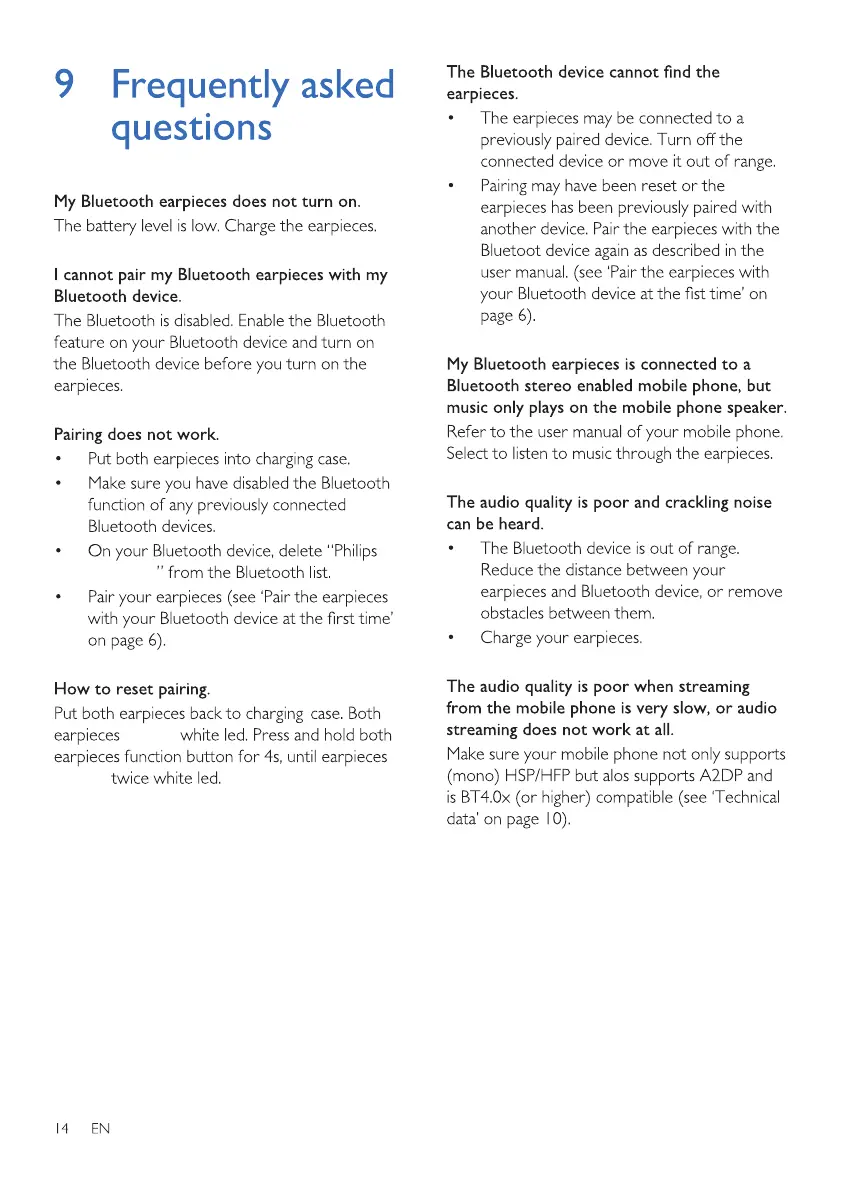 Philips TAT1235 - Frequently asked questions; I cannot pair my Bluetooth earpieces with my Bluetooth device.; Pairing does not work.; How to reset pairing.