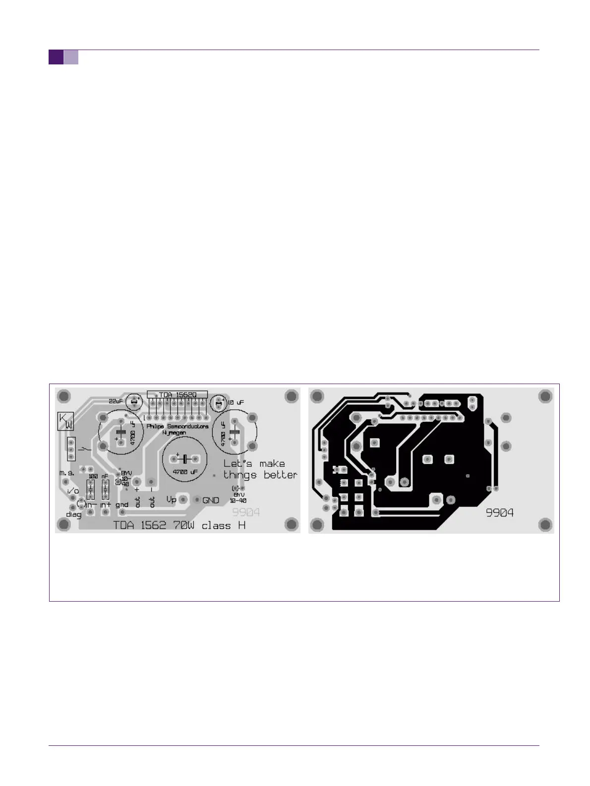 The following figures show the PCB lay-out of the application PCB of the TDA 1562Q.