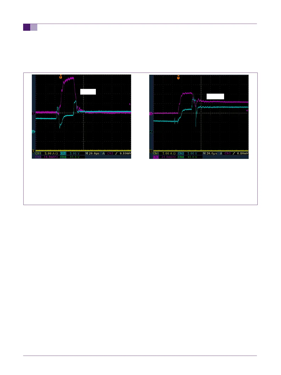 Fig 41. Current flowing into amplifier with positive pulse at output, Ch2 (cyan): Voutput, Ch3 (magenta) : current