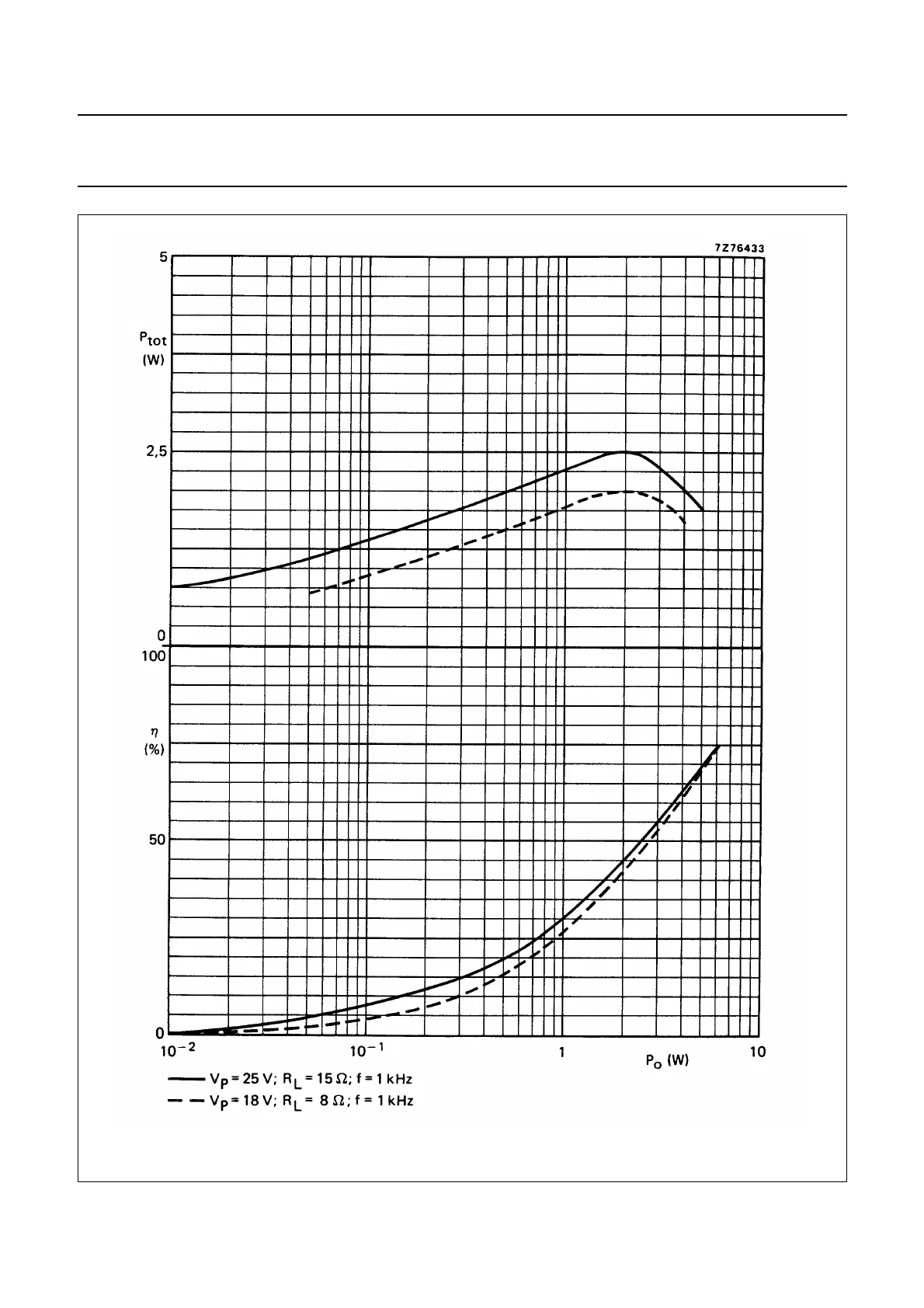 Fig.9 Total power dissipation and efficiency as a function of output power.