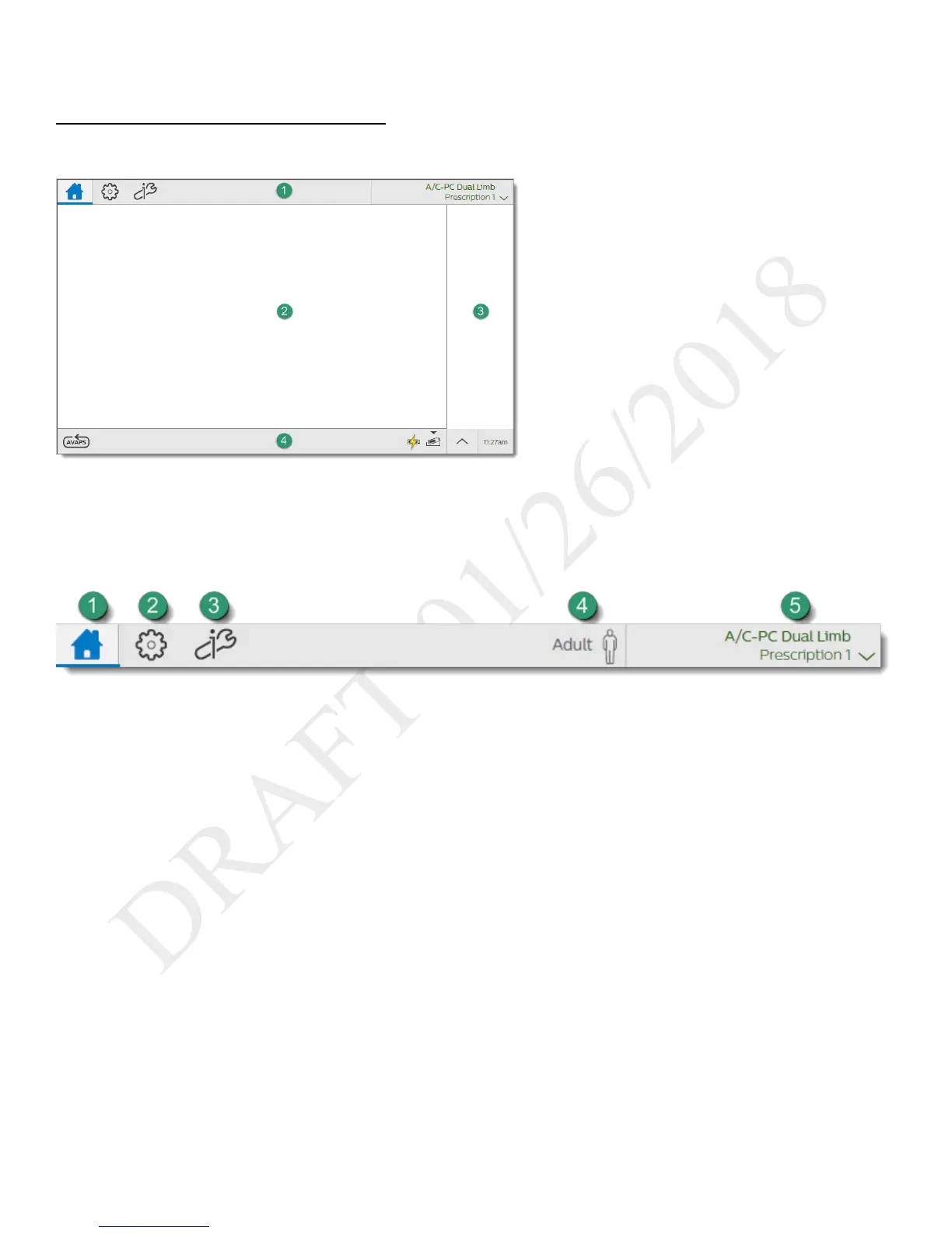 Use the menu bar to navigate, manage alarms, and see the active prescription at a glance.