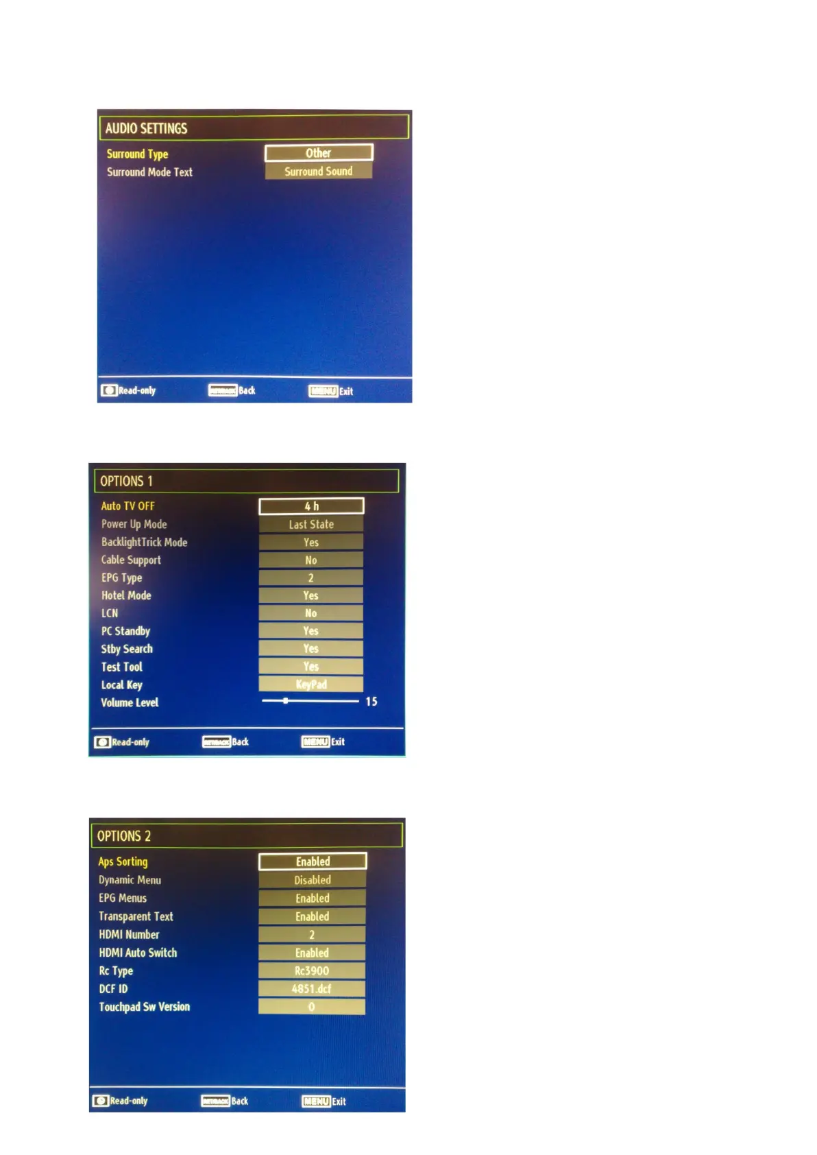 Profile options such as AUTO TV off time, Power up mode, EPG type, etc. are displayed in options 1.