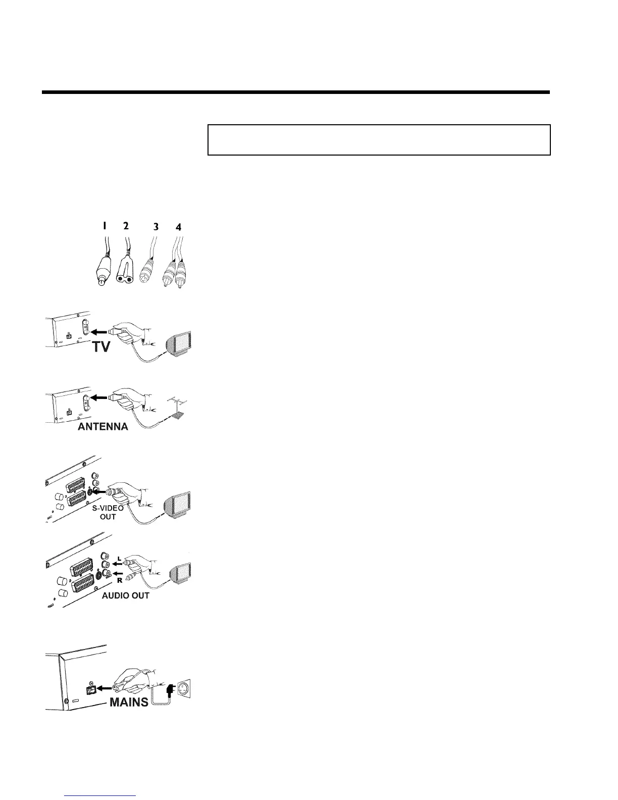 an aerial cable (1, supplied), a mains cable (2, supplied), an S-Video(SVHS) cable (3), an audio
