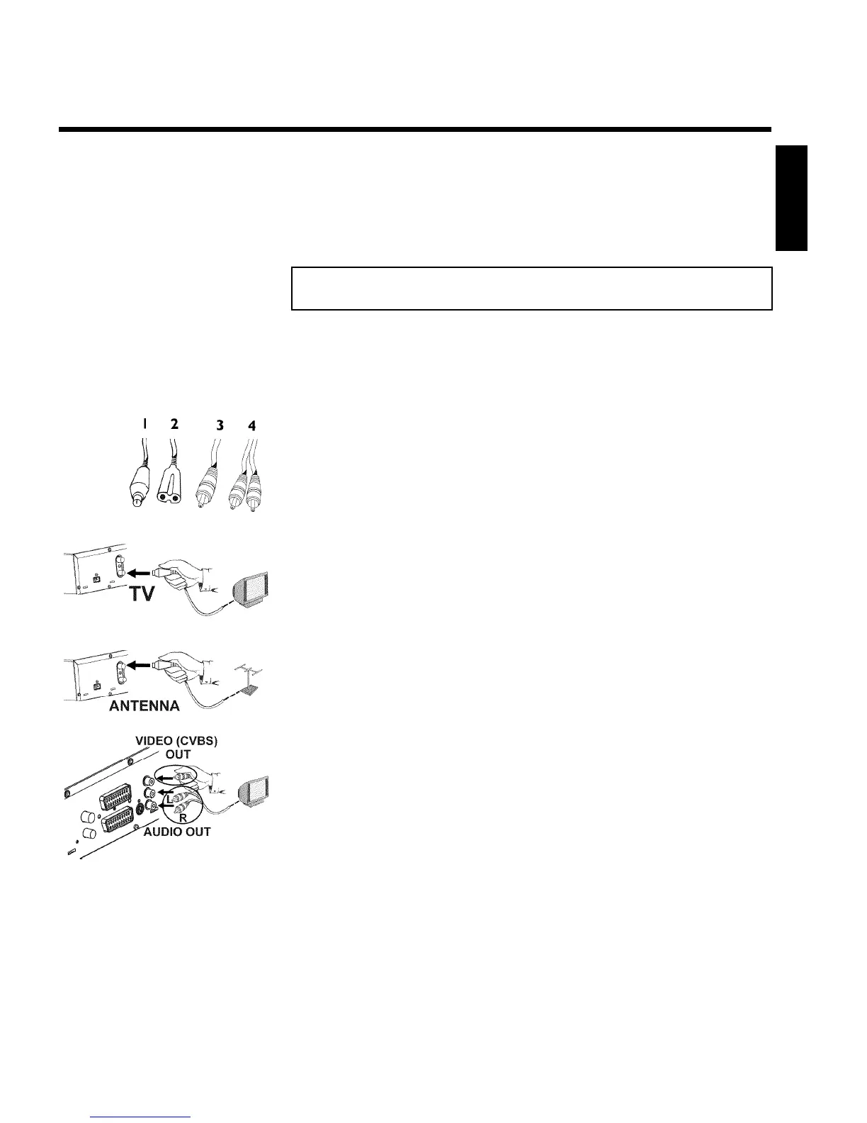 an aerial cable (1, supplied), a mains cable (2, supplied), a video (CVBS)cable (3, supplied, yellow