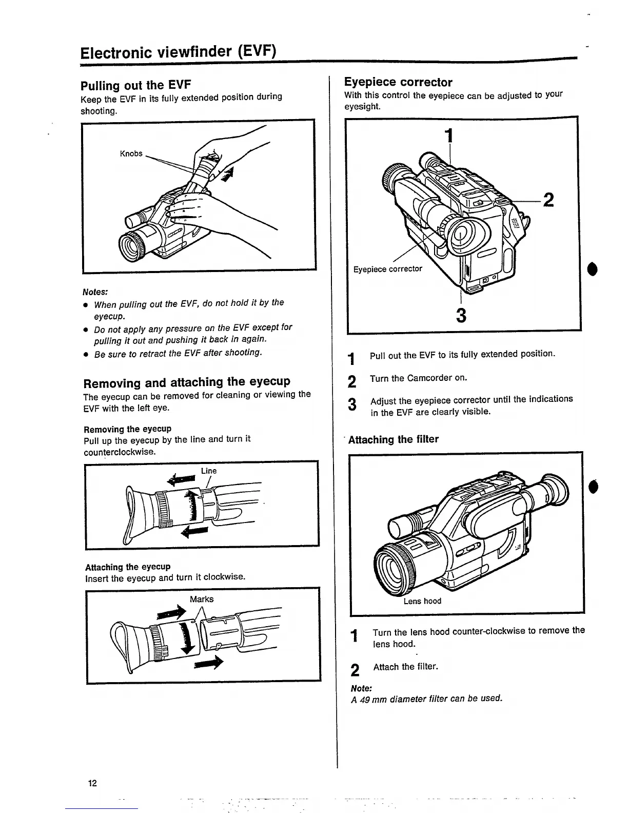 Philips VKR6853/21 - Electronic Viewfinder (EVF) Usage; EVF Extension and Retraction; Eyecup Removal and Attachment; Filter Attachment